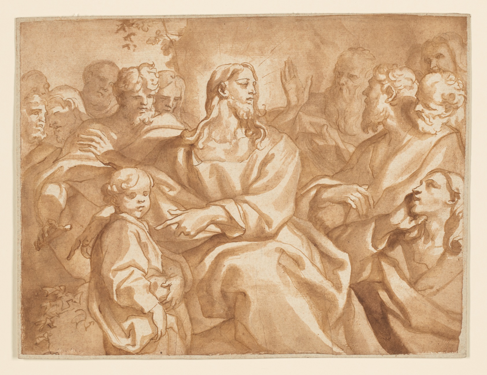 Domenico Piola's *Suffer the Little Children* is a tender devotional study that distills one of the Gospel's most human moments into a quiet interplay of light and line. Piola was the dominant figure in seventeenth-century Genoese painting, running a prolific workshop that shaped the city's religious and decorative art for decades. This work exemplifies his draftsmanship at its most intimate: pen and brown ink laid over black chalk, then softened with a brown wash that gives the composition its warm, flickering quality. It is the kind of sheet that reveals how Baroque masters thought — loose enough to feel spontaneous, controlled enough to read as finished. The drawing's subject, Christ welcoming children turned away by the disciples, was among the most repeated themes in Counter-Reformation devotional art, chosen precisely because it communicated accessibility and grace without demanding theological literacy from its audience. Our hand-painted oil reproduction translates Piola's tonal range — the creamy highlights, the deep shadow pools, the soft mid-tones of the wash — into pigment on canvas, preserving the intimacy of the original while giving it the physical presence and permanence that only oil paint can provide.