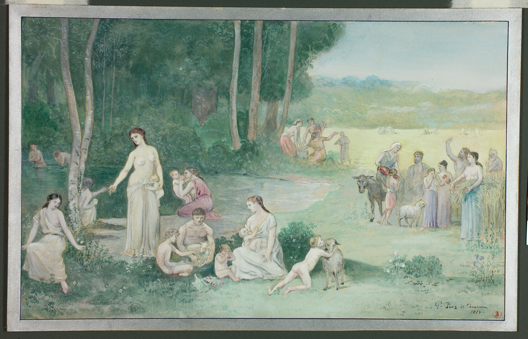 Summer radiates the serene, timeless quality that made Pierre Puvis de Chavannes one of the most admired painters in late nineteenth-century France — a stillness that feels less like a season and more like a state of mind. Puvis de Chavannes built his reputation on large-scale allegorical murals decorating public buildings across Paris, Lyon, and Boston, and his preparatory studies carry the same calm authority as the finished works. This 1873 piece, rendered in watercolor and gouache over graphite with a distinctive silver-painted border, shows his characteristic approach: muted, chalky tones, simplified forms, and a deliberate flattening of space that bridges classical tradition and the emerging modern sensibility. The result is contemplative rather than decorative, grounded rather than grand. His influence stretched far and wide — Gauguin, Seurat, and the Symbolists all acknowledged a debt to his stripped-back, meditative style, and the Art Institute of Chicago, where this work is held, counts it among its significant examples of French academic draftsmanship. Our hand-painted oil reproduction translates Puvis de Chavannes' quiet luminosity onto canvas, preserving the soft gradations and composed stillness of the original so this overlooked masterwork can occupy a wall rather than an archive drawer.