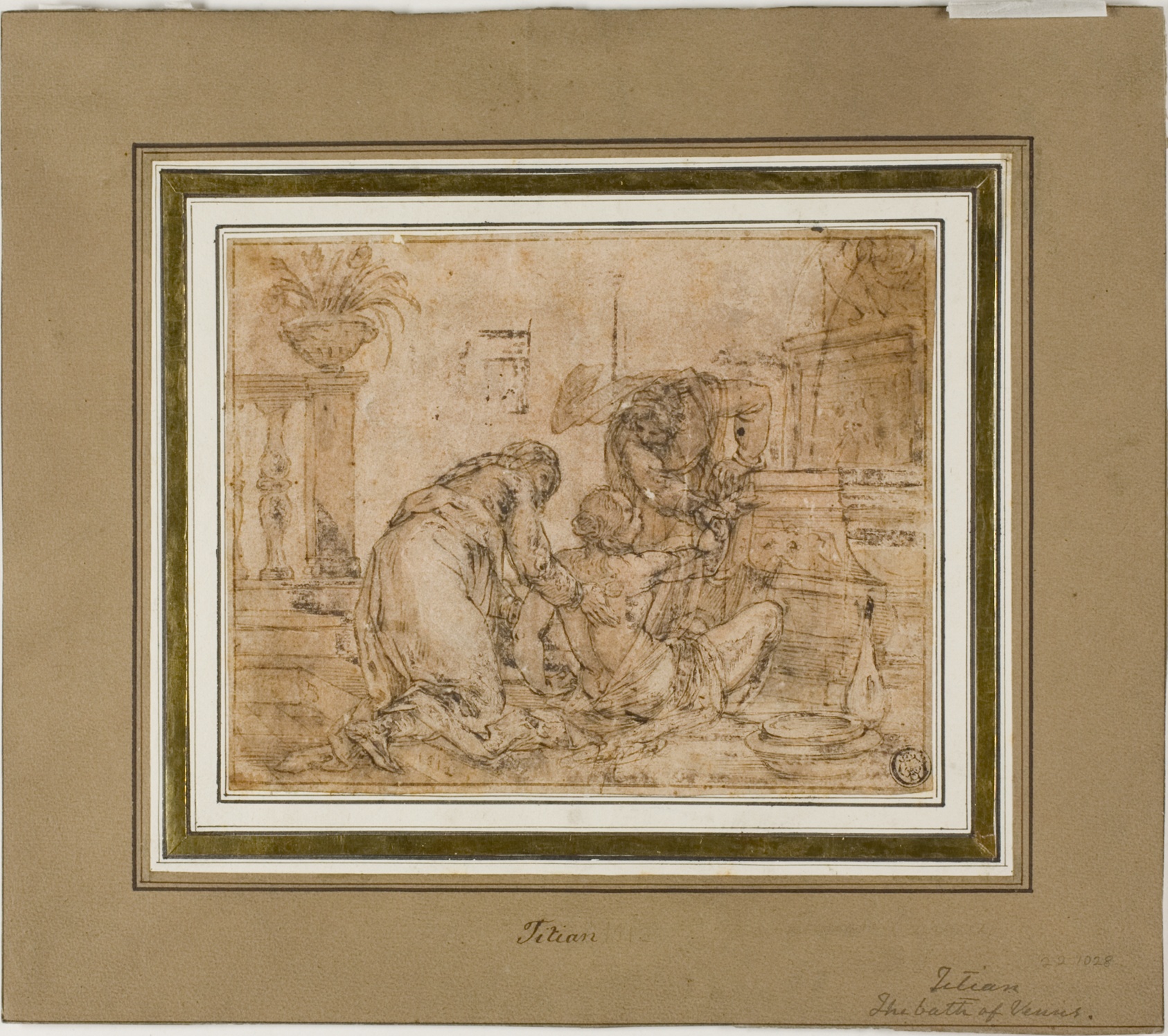 - Pen and brown ink, with brush and brown wash, heightened with traces of white gouache, on buff laid paper, laid down on ivory wove card
