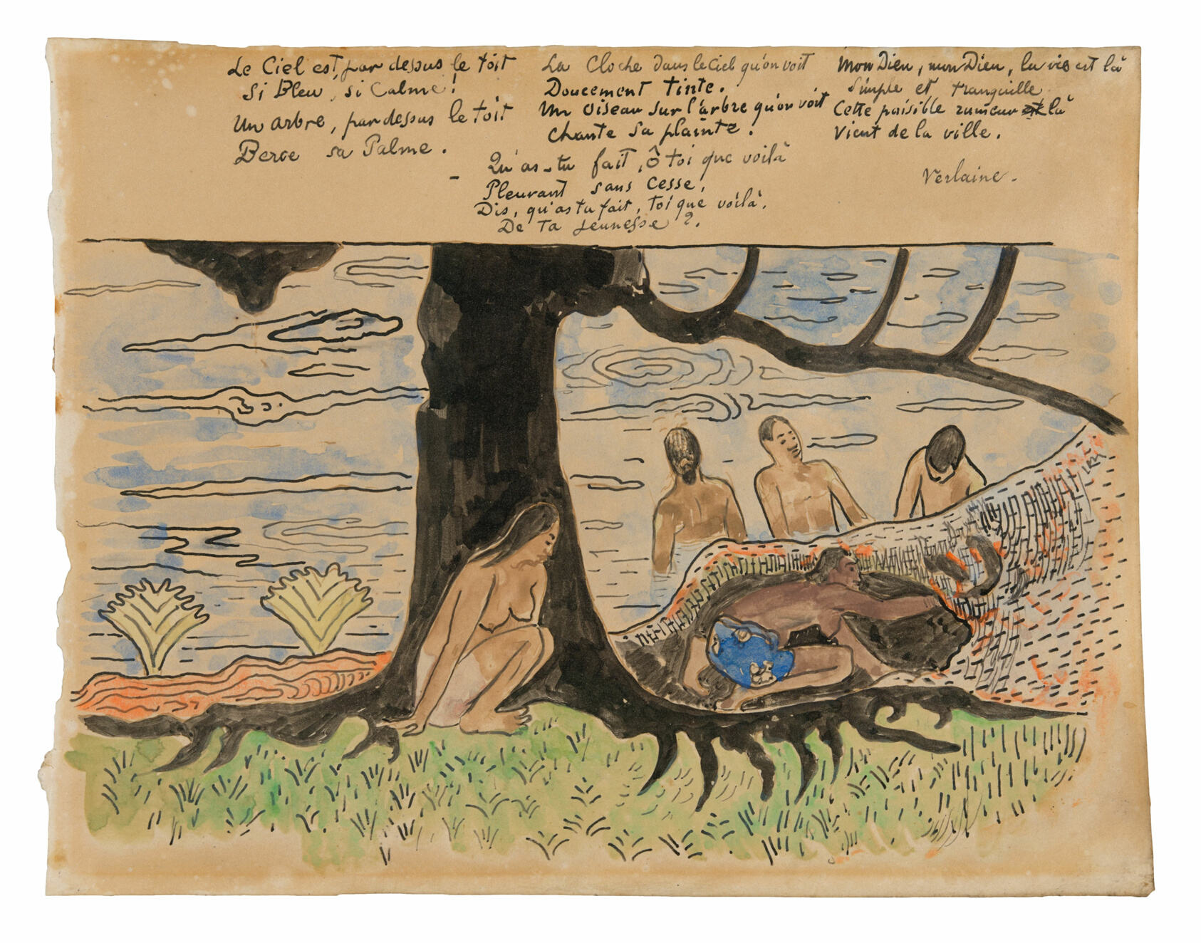 Tahitians Fishing captures a quiet, elemental moment — figures at the water's edge rendered with the directness and warmth that defined Gauguin's Tahitian period. Gauguin arrived in Tahiti in 1891, driven by a desire to escape the conventions of European art and find what he called a more primal truth. This work, executed in ink, watercolor, and gouache on parchment, shows the intimate, sketch-like quality of his observational drawings — less polished than his large canvases but arguably more honest. The fluid brushwork and layered tones reflect his instinct to record life as he encountered it, before composition and symbolism overtook the image. Gauguin documented his first years in Tahiti in a written and illustrated journal, *Noa Noa*, which drew on many of the scenes and figures he sketched during this period — including everyday activities like fishing that he witnessed along the coast. Our hand-painted oil reproduction translates the warmth and atmosphere of the original onto canvas, preserving the gentle tonal contrasts and the feeling of stillness that Gauguin caught in those early Tahitian years. Each piece is painted by hand, making it a singular work rather than a print.