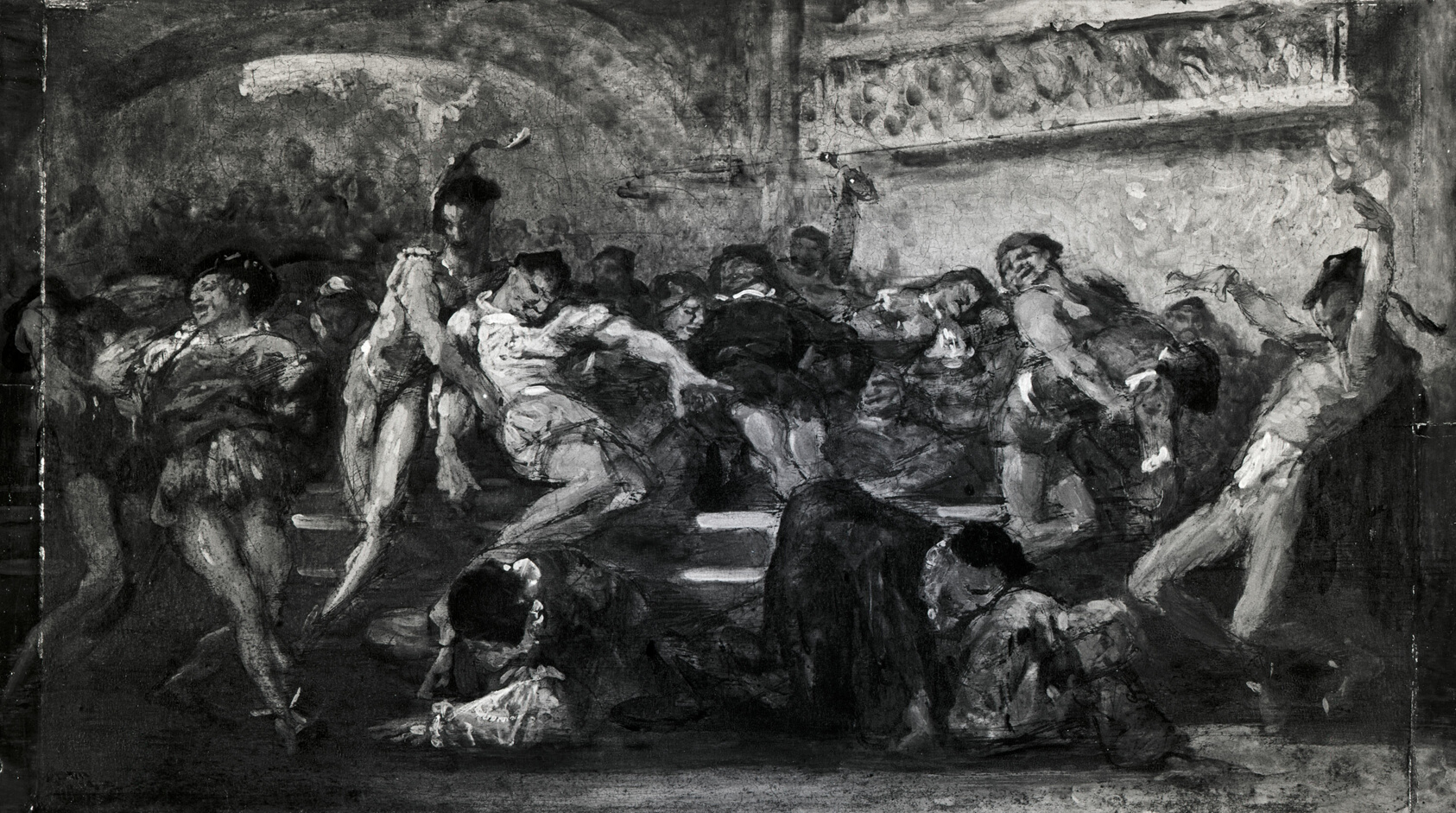 A swirling, candlelit scene of revelry, this mid-nineteenth-century French panel painting carries the charged atmosphere of a literary world on the edge of moral collapse — whether or not Goethe's Faust was truly its source. French painters of the 1860s and 1870s worked in the long shadow of Romanticism, and scenes of carousing figures drawn from literature or history were a favoured vehicle for exploring light, gesture, and collective abandon. The oil-on-panel format — more common in earlier centuries but still used by French painters for smaller, intimate works — lends the composition a jewelled intensity, the paint sitting close and luminous against a rigid ground. The brushwork typical of this era balances loose figural energy with careful tonal gradation, giving the scene both spontaneity and weight. The question mark in the work's own title is telling: even the Art Institute of Chicago, which holds the original, leaves open whether the subject is a direct illustration of Faust or simply evokes its spirit — a reflection of how thoroughly Goethe's drama had saturated French visual culture following Delacroix's celebrated Faust lithographs of 1828. A skilled hand-painted oil reproduction brings this atmospheric quality fully to life, preserving the warmth, depth, and painterly texture that a print simply cannot replicate.