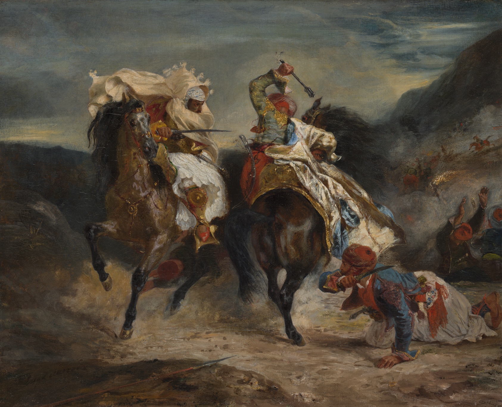 Few paintings capture the chaos of hand-to-hand combat with the visceral intensity that Delacroix brought to this 1826 scene from Lord Byron's narrative poem *The Giaour*. Delacroix was at the heart of the French Romantic movement, and this work shows why — his loose, energetic brushwork and bold use of colour set him apart from the controlled neoclassicism that dominated French painting at the time. The horses rear and collide in a tangle of bodies, the figures barely distinguishable from one another in the fury of the moment, yet every element feels purposeful. Delacroix was fascinated by violence not as spectacle but as emotion, and that distinction gives the painting its psychological weight. Delacroix returned to the subject of the Giaour and Hassan multiple times throughout his career, producing several versions — a sign of how deeply Byron's poem gripped his imagination in the years following its enormous popularity across Europe. This hand-painted oil reproduction follows the original canvas closely, preserving the loose, gestural quality of Delacroix's brushwork and the rich contrasts of shadow and firelight that give the scene its dramatic force — details that would be lost in any printed copy.