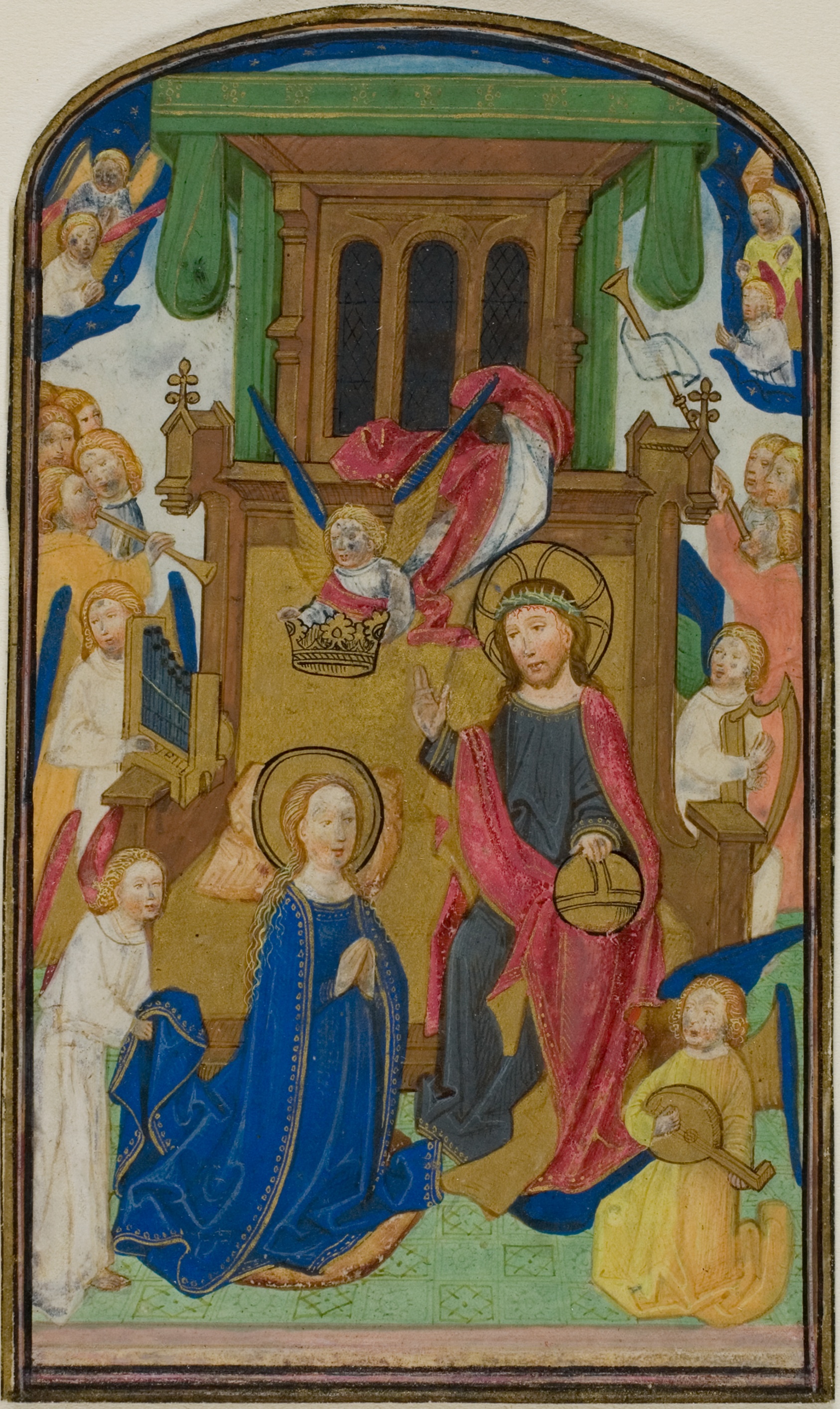 Painted on a single leaf of parchment barely larger than a human hand, this radiant scene of the Virgin's coronation distills the entire devotional world of fifteenth-century Flanders into a few square inches of colour and gold. Willem Vrelant was among the most sought-after illuminators working in Bruges during the city's golden age as a centre of manuscript production. A member of the Guild of St. John and a supplier to the Burgundian court, he brought a distinctive clarity to his figures — faces that are tender rather than stylised, drapery that falls with quiet weight. His technique here combines fine tempera pigments with liquid gold, a subtler approach than raised gilding that allows the gold to breathe within the composition rather than dominating it. Books of Hours were the personal devotional books of the wealthy, and individual leaves were sometimes cut from damaged volumes and collected as independent works of art — which is how this cutting came to the Art Institute of Chicago. The hand-painted oil reproduction translates Vrelant's intimate scale into a format made to be lived with, rendering his jewel-like palette and the luminous warmth of the gold with the depth that only brushwork on canvas can achieve.