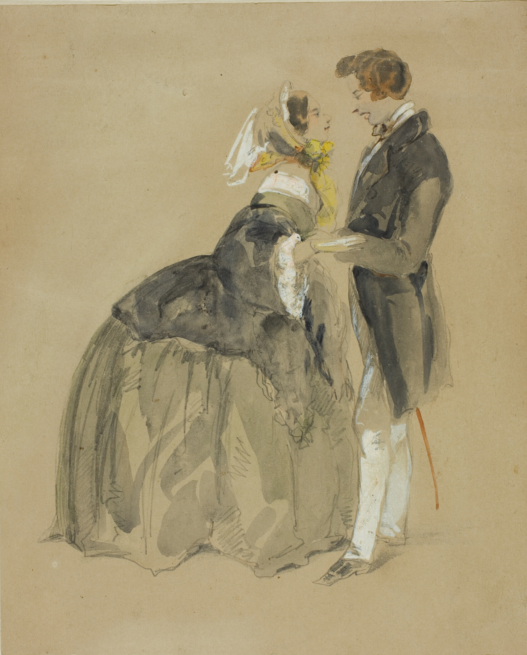 "The Couple" draws you in with the quiet closeness of two figures sharing a moment that feels entirely private — an intimate scene rendered with the understated warmth Charles-Edouard de Beaumont made his own. A French artist and illustrator working through the middle decades of the nineteenth century, de Beaumont brought a sophisticated eye to the small rituals of Parisian social life: courtship, conversation, the easy familiarity between people who know each other well. His choice of watercolor and gouache over a graphite underdrawing on tan wove paper is deliberate — he builds up soft, layered colour while letting the warm tone of the paper work through the composition, creating an atmosphere that feels settled rather than staged. The careful pencil lines visible beneath the paint reveal just how much thought lies behind the effortless surface. De Beaumont contributed regularly to Le Charivari, the celebrated French satirical periodical, and his work there showed the same sensitivity to human warmth that marks this piece. This hand-painted oil reproduction honours the tenderness of the original, translating its layered intimacy into oils on canvas with the attention the subject deserves.