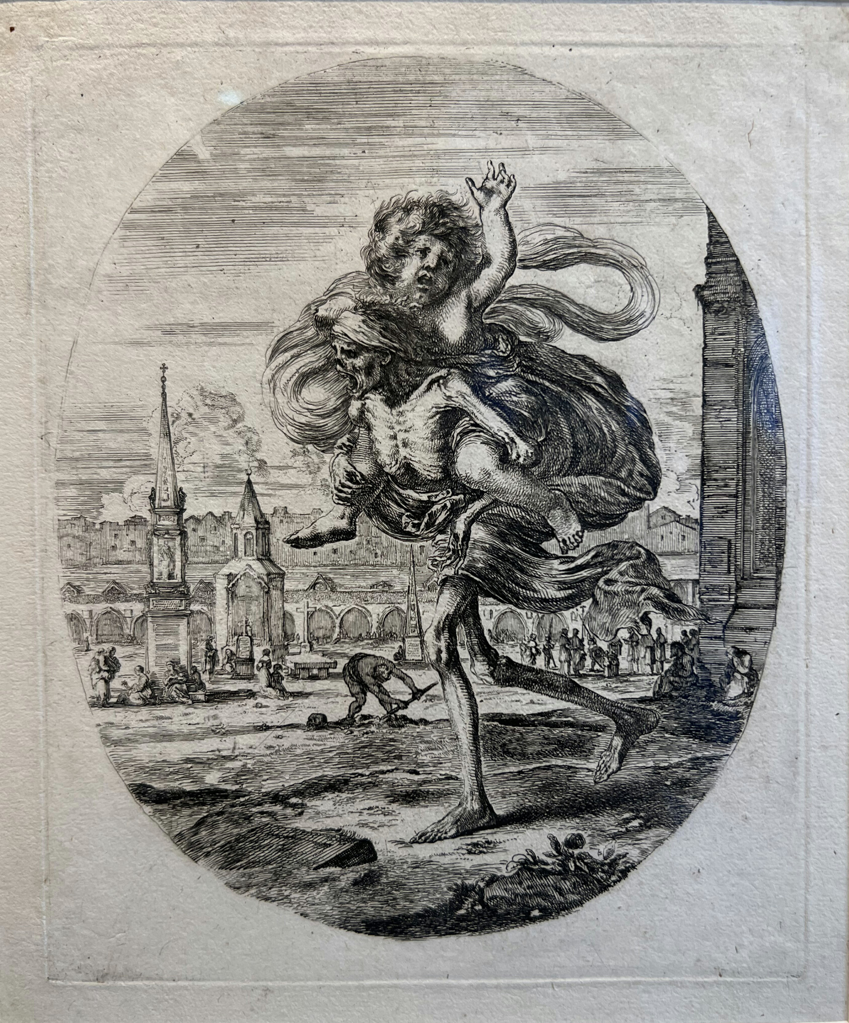 Few printmakers in the seventeenth century rendered mortality with both such delicacy and such unease as Stefano della Bella achieved in *The Five Deaths*. A Florentine by birth, della Bella spent formative years in Paris under the patronage of Cardinal de Medici before returning to Florence, absorbing the influence of Jacques Callot along the way. His engraving technique was unusually refined for the period — fine, layered lines that give his skeletal and spectral figures a strange softness, almost tenderness, at odds with their subject matter. *The Five Deaths* exemplifies this: five personifications of death, each distinct in posture and context, arranged with a compositional elegance that makes the morbid feel almost meditative. Della Bella produced over a thousand prints across his career, and his death-themed works proved widely influential on later Baroque printmaking throughout Europe. Because the original is a work on paper — ink and pressure rather than pigment — translating it into oil requires an interpreter as much as a copyist. Our artists render della Bella's characteristic linework in tone and texture, giving the piece the physical presence and warmth of a painting while honouring the precise, spare drama that has kept this image compelling for nearly four centuries.