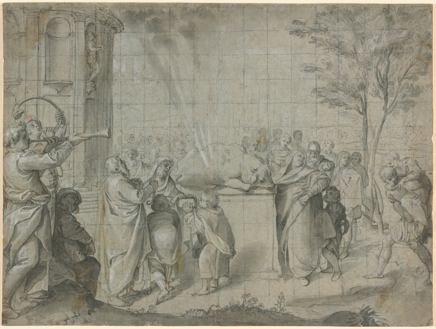 - Pen and black ink and brush and gray wash, heightened with white gouache, over black chalk, on blue laid paper, squared in black chalk