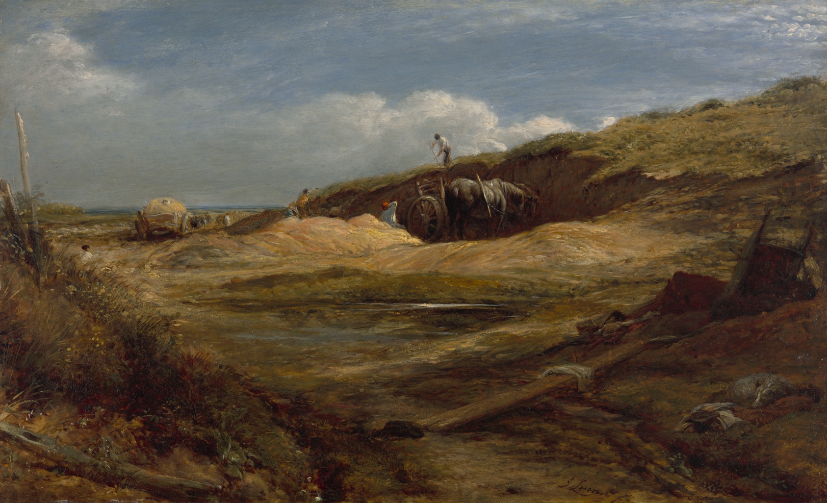 Painted during a period when Hampstead Heath drew artists seeking the honest textures of working English landscape, Linnell's intimate panel captures the sandstone excavations with an almost geological attentiveness — earthy, unromantic, and quietly alive. John Linnell occupies a curious position in British art history: a committed naturalist who moved in the visionary circles of William Blake (whose daughter he married into, and whose later years he supported as a patron) yet never abandoned his deep loyalty to observed fact. In *The Sand Pits*, that tension resolves into something understated and confident — loose, directional brushwork records shifting light across raw terrain without sentimentalising it. Working on panel rather than canvas gave Linnell a firm, smooth ground that allowed fine tonal gradations, and you can feel that precision in the way the sky settles behind the exposed earth. Linnell painted Hampstead Heath repeatedly through the 1820s and 1830s before settling in Surrey, and the Heath scenes from this period are considered among his most personally felt works. This hand-painted oil reproduction is made by a skilled artist working directly from the original, matching Linnell's measured palette and the characteristic weight of paint on a rigid support — the result is as close to standing before the Art Institute's panel as most viewers will ever come.