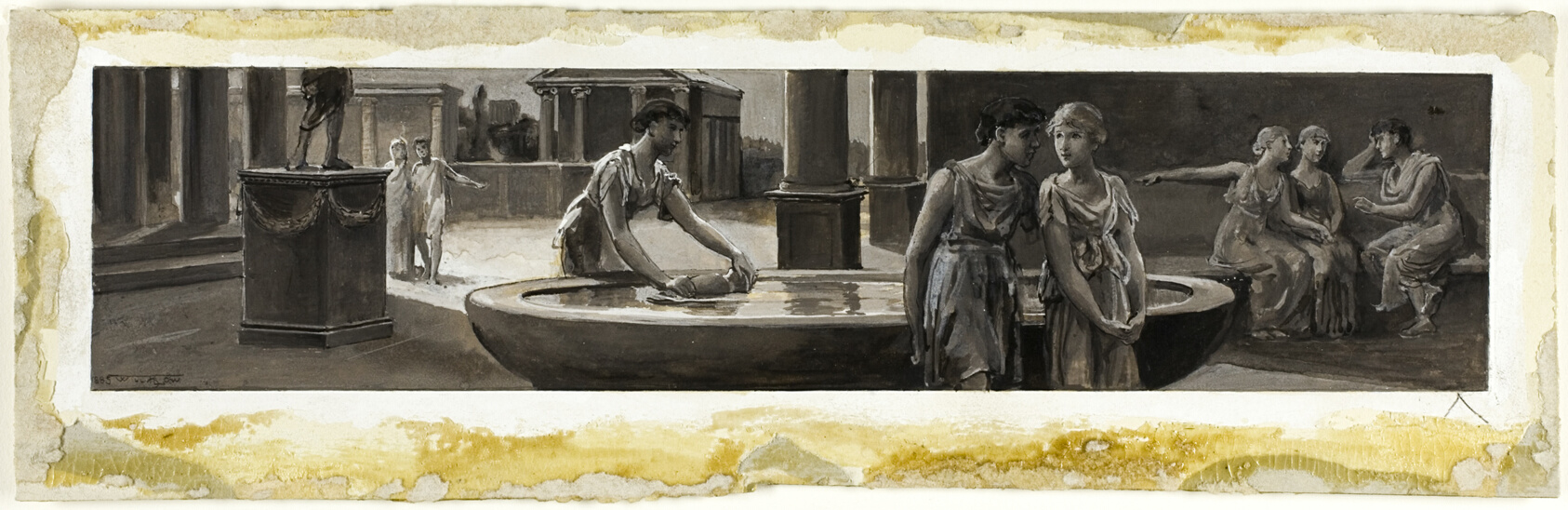 - Brown and gray gouache, heightened with touches of white gouache, on cream wood-pulp laminate board