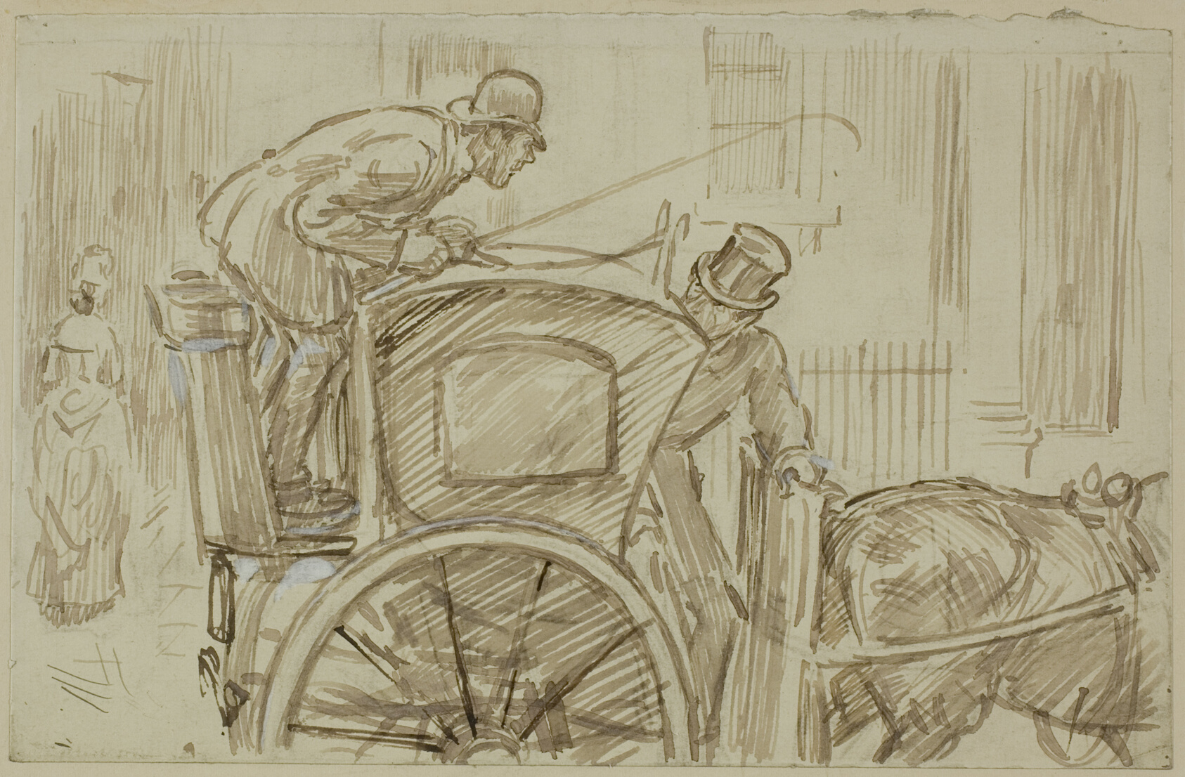 - Pen and brown ink, with touches of white gouache, over black chalk, on cream wove paper, laid down on buff wove card