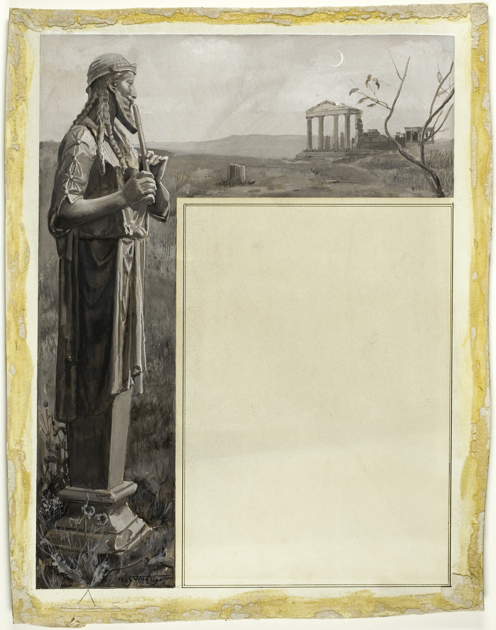 - Black and gray gouache, heightened with touches of white gouache, on cream wood-pulp laminate board