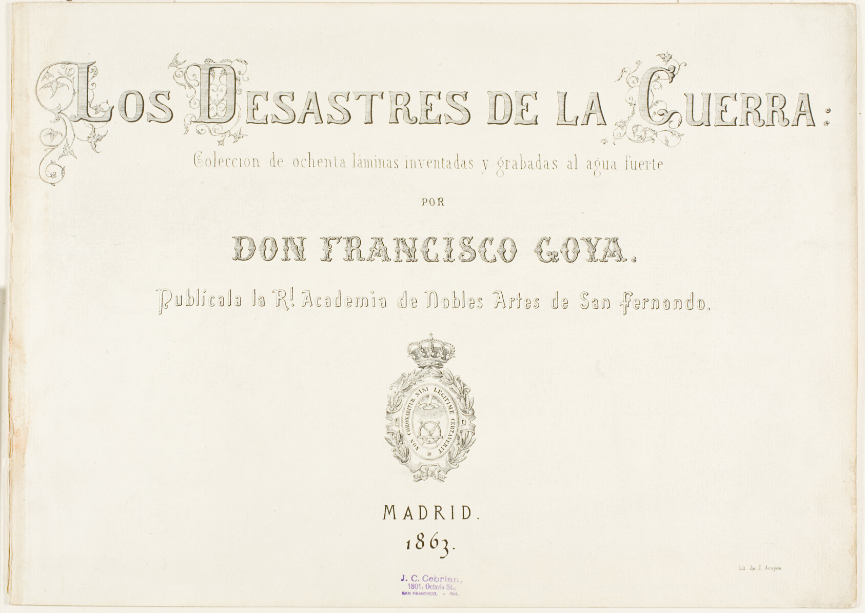The title page of *The Disasters of War* serves as the solemn threshold to one of the most devastating visual documents in Western art — Goya's unflinching record of the Napoleonic invasion of Spain and its aftermath. Francisco Goya spent decades as a celebrated court painter before the horrors of the Peninsular War (1808–1814) redirected his vision entirely. Where his earlier work dazzled with light and social grace, his later output stripped everything away in favour of raw, almost reportorial truth. The series to which this title page belongs comprises 82 prints depicting mutilation, execution, and famine with a directness that no artist had attempted at that scale before. Goya completed the series around 1820 but never saw it published; the Royal Academy of Fine Arts in Madrid released the prints in 1863, thirty-five years after his death, fearing the political consequences of earlier publication. This hand-painted oil reproduction honours the gravity of the original, rendering the dense lettering, worn texture, and muted tonal weight of the 1863 edition with the same care Goya brought to everything he considered worth preserving — even when the world was not yet ready to look.