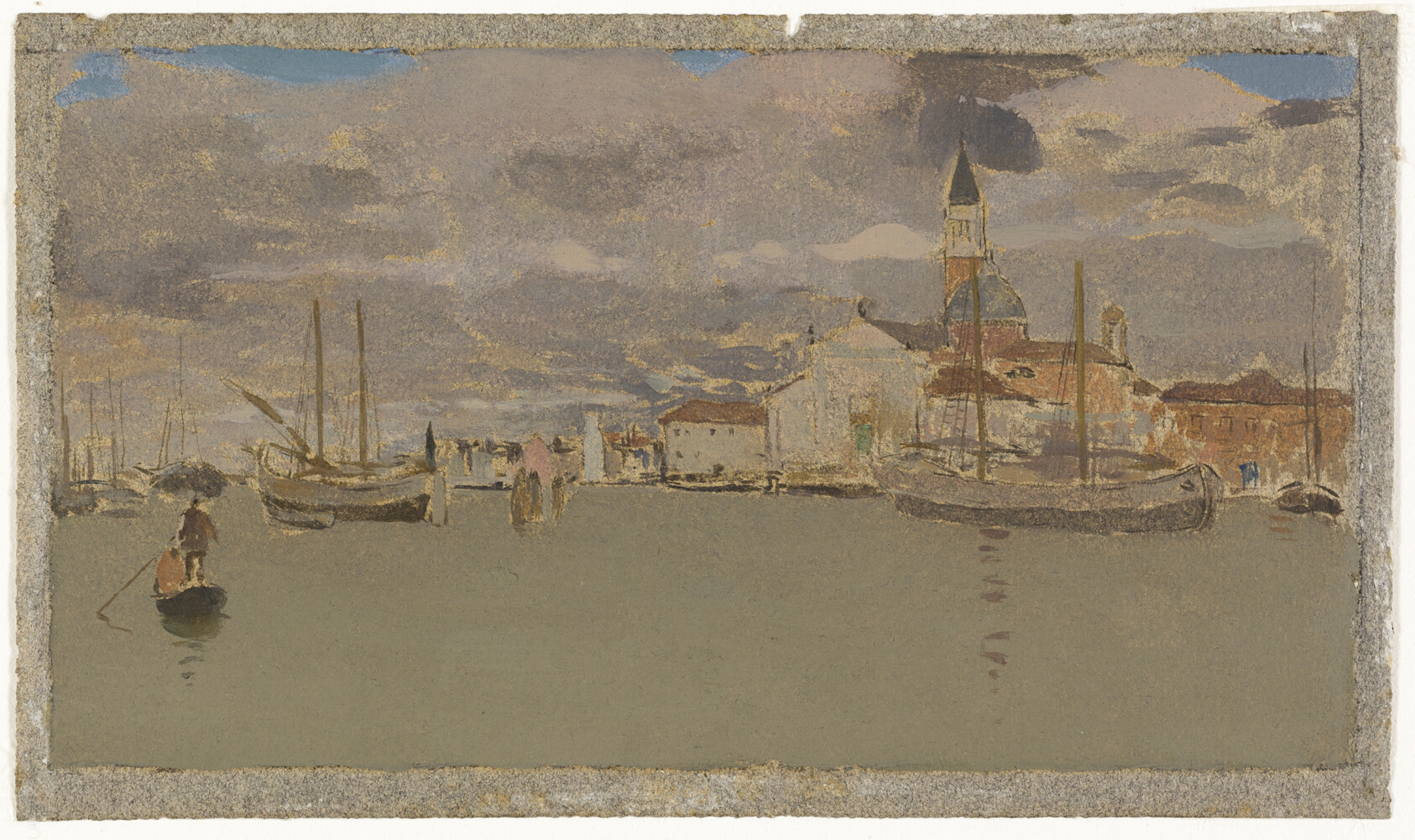 Venetian Atmosphere distills the city to its essentials — water, light, and the soft dissolution of form into mist. Whistler arrived in Venice in 1879, commissioned by the Fine Art Society to produce a series of etchings, and ended up staying fourteen months. The gray wove paper with black fibers is not incidental here; it functions as a mid-tone ground, allowing Whistler to work both light and dark simultaneously with his oil and gouache, letting the paper itself read as the city's perpetual haze. This approach — building atmosphere from the substrate up rather than layering it on — is what separates his Venetian work from nearly every other artist who painted the same canals. Whistler called the Venice assignment an ordeal but produced over fifty etchings, nearly a hundred pastels, and several oil studies that critics later considered the finest work of his career. The hand-painted oil reproduction preserves what makes this piece so quietly commanding: the tonal restraint, the way forms emerge just enough to suggest architecture before receding back into gray, and the particular stillness that only comes from a painter who understood that leaving something out is itself a technique.