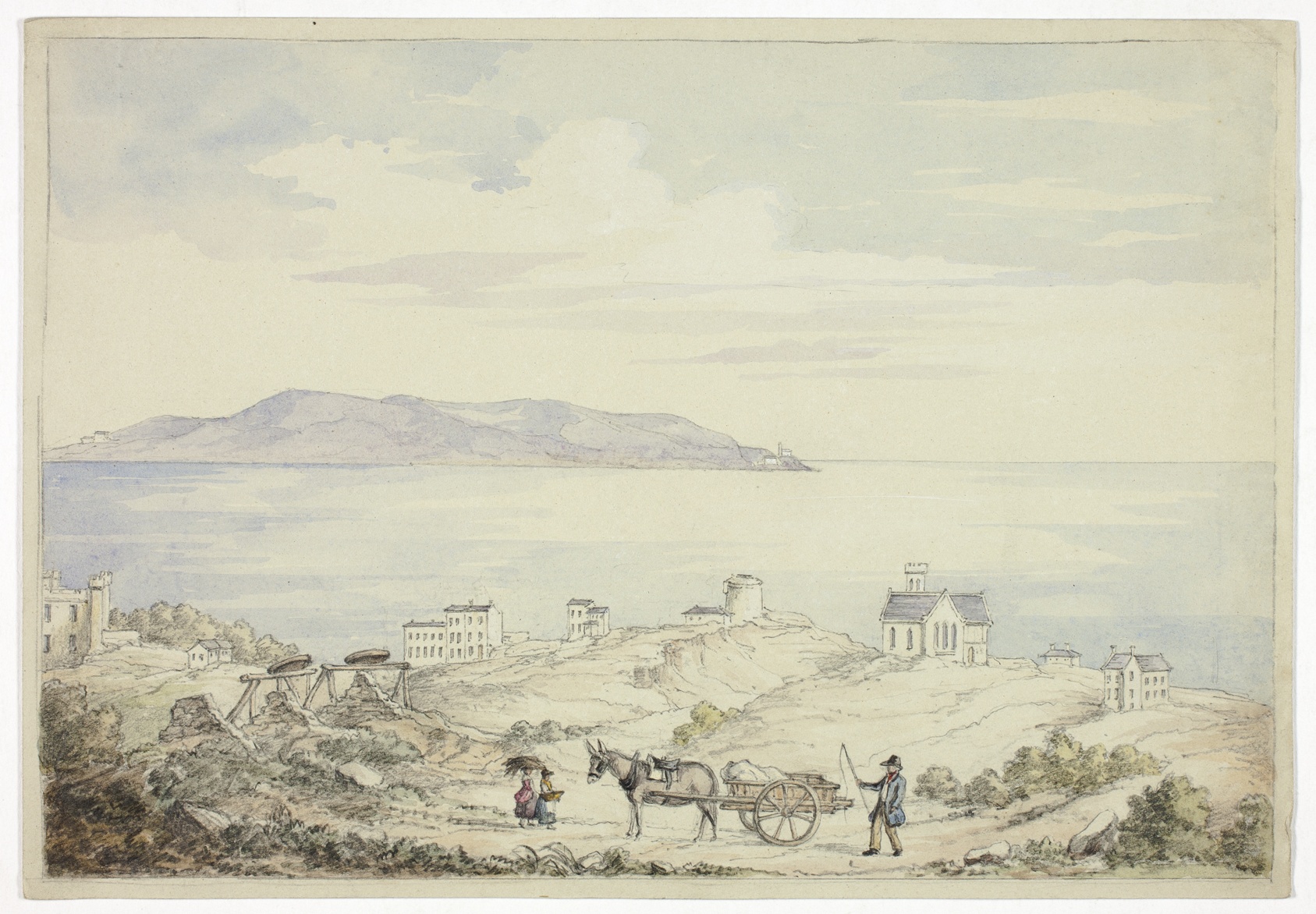 View of Dalkey from the Road offers a quietly luminous glimpse of the Irish coastline as seen through the careful eye of a seasoned traveler, its muted palette and precise draftsmanship giving the scene an intimate, almost diary-like quality. Elizabeth Murray was a British watercolorist who spent much of her career moving between the Mediterranean world and the British Isles, developing a practiced facility for capturing light and atmosphere in unfamiliar landscapes. Her choice of gray wove paper here is telling: rather than working up from white, she exploited the paper's cool mid-tone as an ambient ground, using white gouache selectively to pull out highlights and give the clouded Irish sky its subdued weight. The graphite underdrawing, still faintly visible beneath the washes, reveals the methodical structure beneath the apparent spontaneity. Murray was one of the relatively few professional women watercolorists of her era to build a sustained career through travel and publication, later documenting her years abroad in a well-regarded illustrated memoir. This hand-painted oil reproduction translates Murray's delicate layering and tonal restraint into a medium with greater physical presence, preserving the composition's careful balance of land, sky, and distance while giving the scene the depth and warmth that oil on canvas naturally lends to nineteenth-century landscape work.