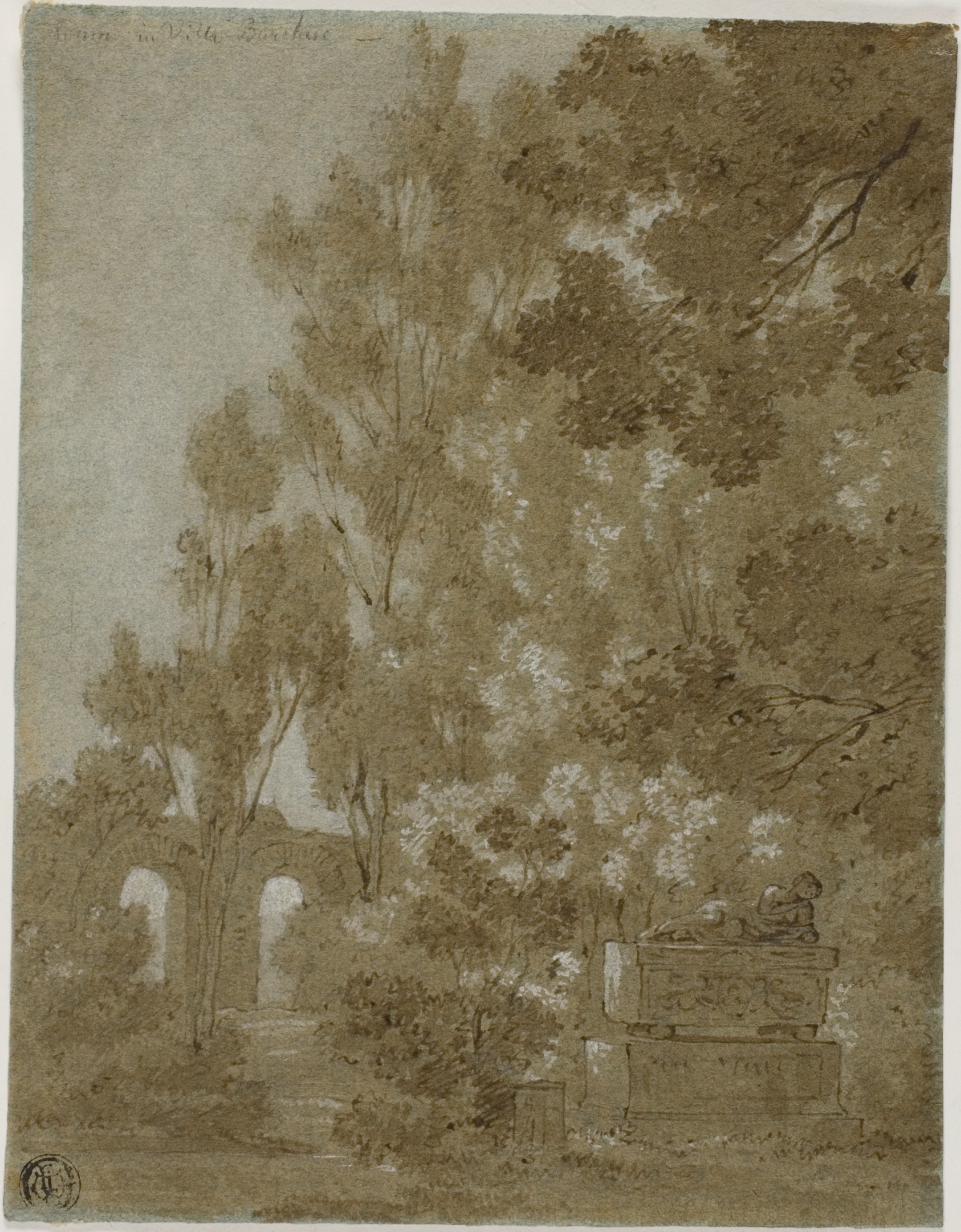 Gaspard Dughet's study of ruined arches and a tomb within Rome's Villa Borghese grounds carries the quiet authority of someone who spent a lifetime learning to see ancient landscape as a living thing. Dughet was born in Rome in 1615 to French parents and grew up in the household of Nicolas Poussin — his brother-in-law — absorbing that master's discipline for classical order while developing his own looser, more atmospheric sensibility. This drawing reveals his working process directly: the verso is incised and blackened for transfer, meaning the sheet was a practical tool, a stepping stone toward a finished composition rather than a display piece. The combination of pen, brown ink, and brown wash, heightened with white gouache on blue laid paper, produces a striking tonal range — shadows pool beneath the arches while the gouache catches light on crumbling stonework with remarkable economy. Dughet was so associated with Poussin's legacy that he was widely known during his lifetime simply as "Gaspard Poussin," a name that followed him into the following century. The hand-painted oil reproduction translates the drawing's delicate layering of tone and light into the richer, more permanent medium of oil on canvas, honouring both the intimacy of the original sketch and the grandeur of its Roman subject.
