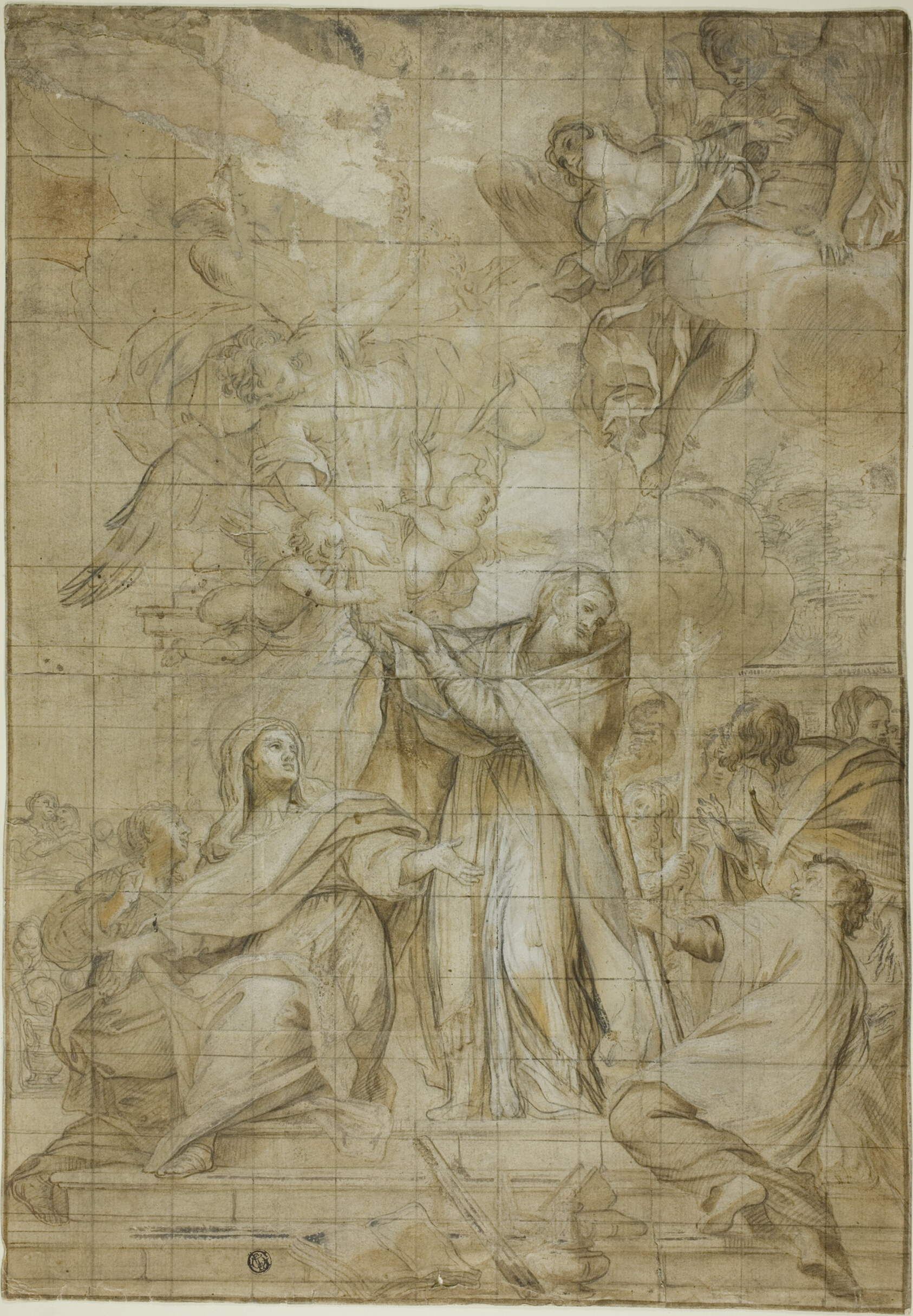 - Pen and red brown ink with brush and brown wash and gouache, heightened with lead white (partly discolored), over black chalk, squared in black chalk, on ivory laid paper, partially laid down