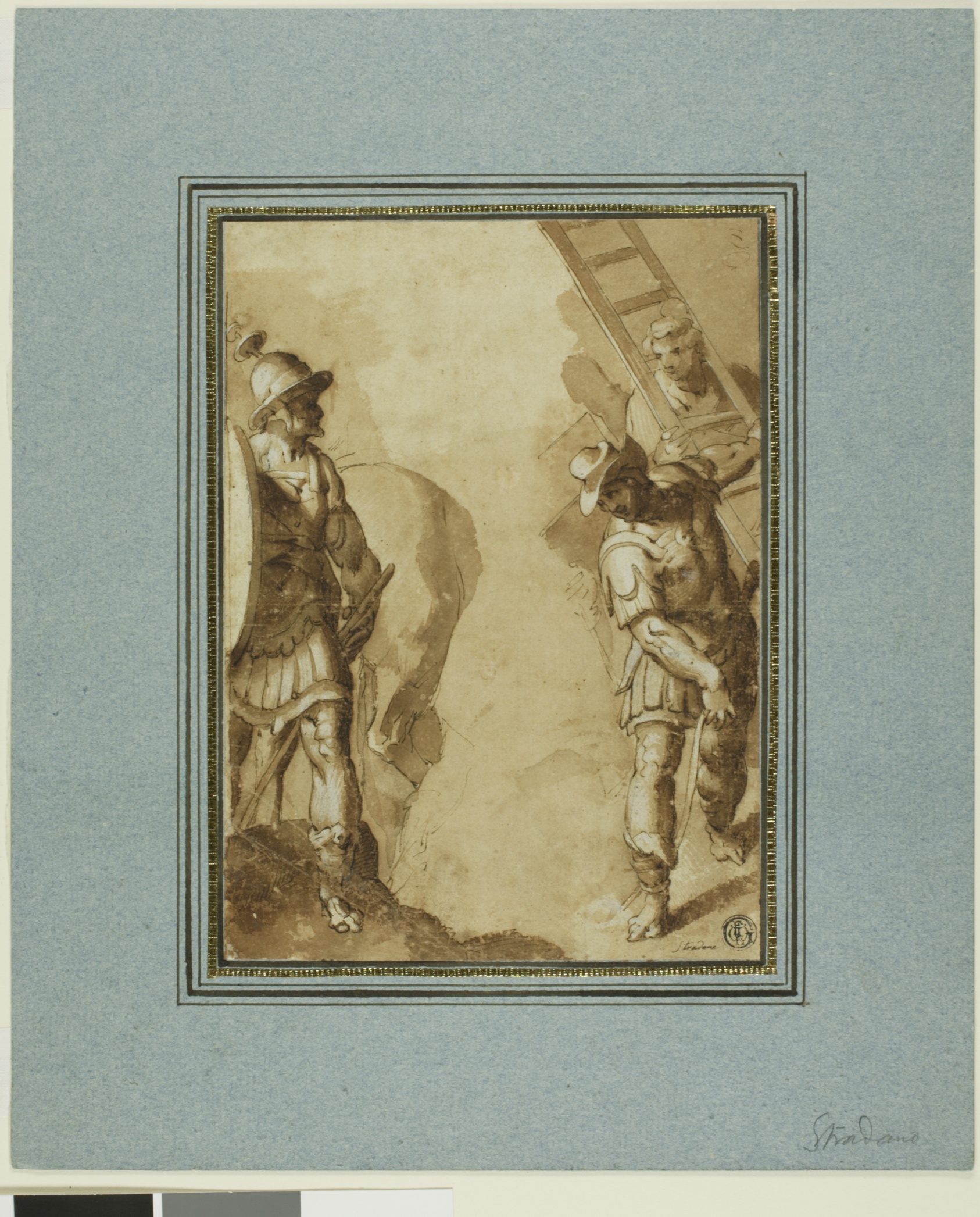 - Pen and brown ink with brush and brown wash, heightened with white gouache, on cream laid paper, laid down on blue card