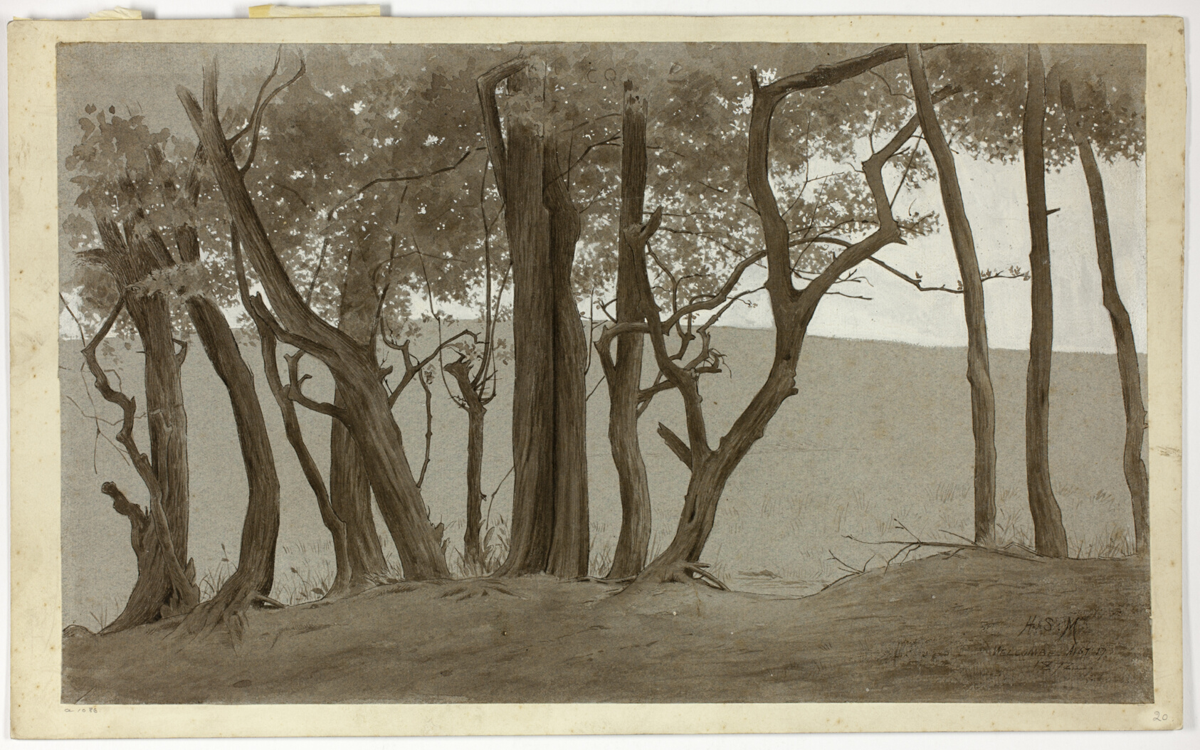 - Pen and brown ink and brush and brown wash, with white gouache, on blue wove paper, laid down on board