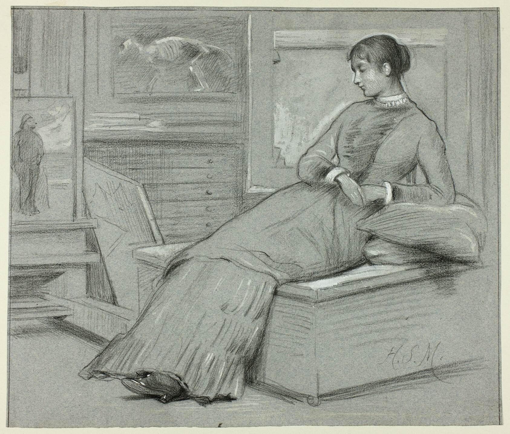 A study in quiet stillness, this drawing captures a seated woman in repose with an economy of line that reveals Marks's mastery of tonal draftsmanship. Henry Stacy Marks was a prominent figure in Victorian British art, best known for his witty paintings of birds — particularly herons and cranes — though his draughtsmanship extended well beyond his celebrated avian subjects. Working in black pastel heightened with white gouache on blue laid paper, he exploited the mid-tone of the support itself as a third value, a classical technique that gives the figure its sense of gentle, ambient light. The restrained palette — near-monochrome, with just the cold blue ground breathing through — lends the composition an intimacy rarely achieved in more elaborate media. Marks was elected a full member of the Royal Academy in 1883 and was regarded by contemporaries as one of the most technically versatile draughtsmen of his generation, equally at home with satirical illustration and refined figurative work. Our hand-painted oil reproduction translates the tonal subtlety of the original into a medium that carries its own warmth and depth, preserving the delicate interplay of light and shadow while giving the image the physical presence that only oil on canvas can provide.
